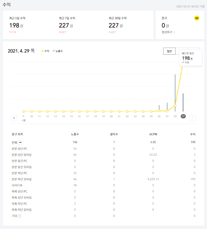 구글 애드센스도 승인 후 4일동안 총 수익은